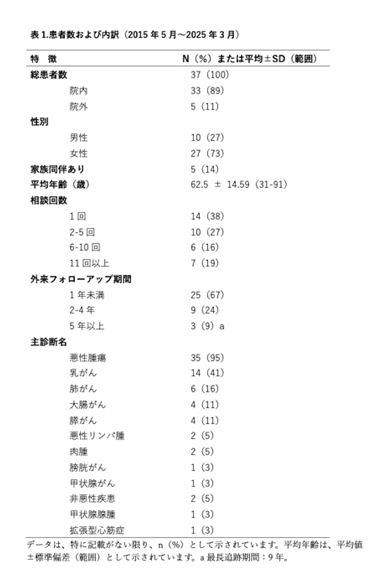 面談は、主治医や看護師からの紹介、または患者・家族からの自発的な申し込みによって行われた。この間の患者の背景、相談回数、フォローアップ期間、疾患の種類を表1(左画像参照)にした。面談後の病理医による記録や患者からのフィードバックを質的に分析した結果、「理解の深化」「情緒的安堵」「自律性の強化」という3つのテーマが帰納的に抽出された。患者の多くは、「安心した」「理解できた」「前向きになれた」と語り、初回面談では沈んでいた表情に笑顔が戻るケースも少なくなかった。